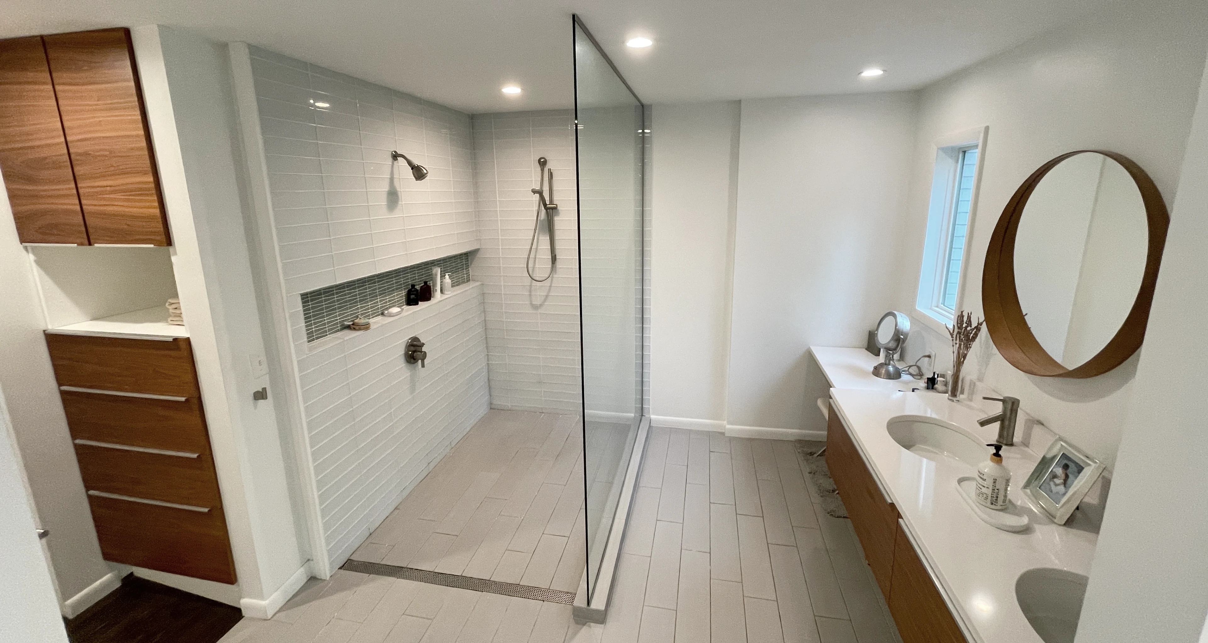 The owners also undertook the task of renovating the bedrooms for modern living. In particular, the master bedroom was remade into a large and functional master suite with walk in closet, a wide floor to ceiling glass wall zero-entry shower and a large double sink vanity and make-up nook.