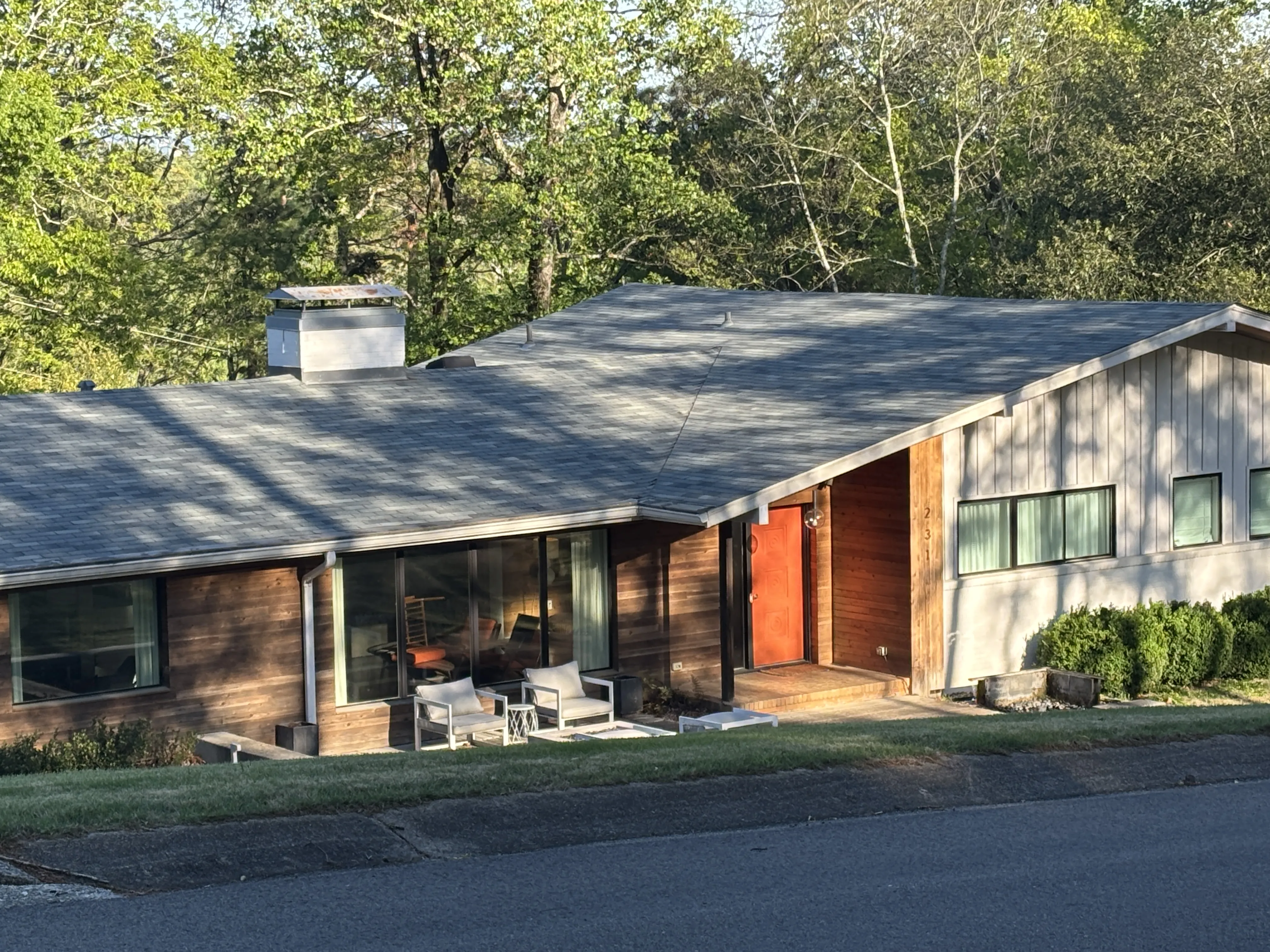 The drafty, single-pane aluminum rollout windows were obscured by steel security bars, while the front porch and entry lacked warmth or architectural character, offering little in the way of curb appeal.The new owners undertook a year long remodel effort with the help of a local architect and builder. The vision was to build upon the home's midcentury inspired architecture with a dramatic exterior reskin and a full interior remodel. Here's a shot of the home as it stood when the owner's acquired it: