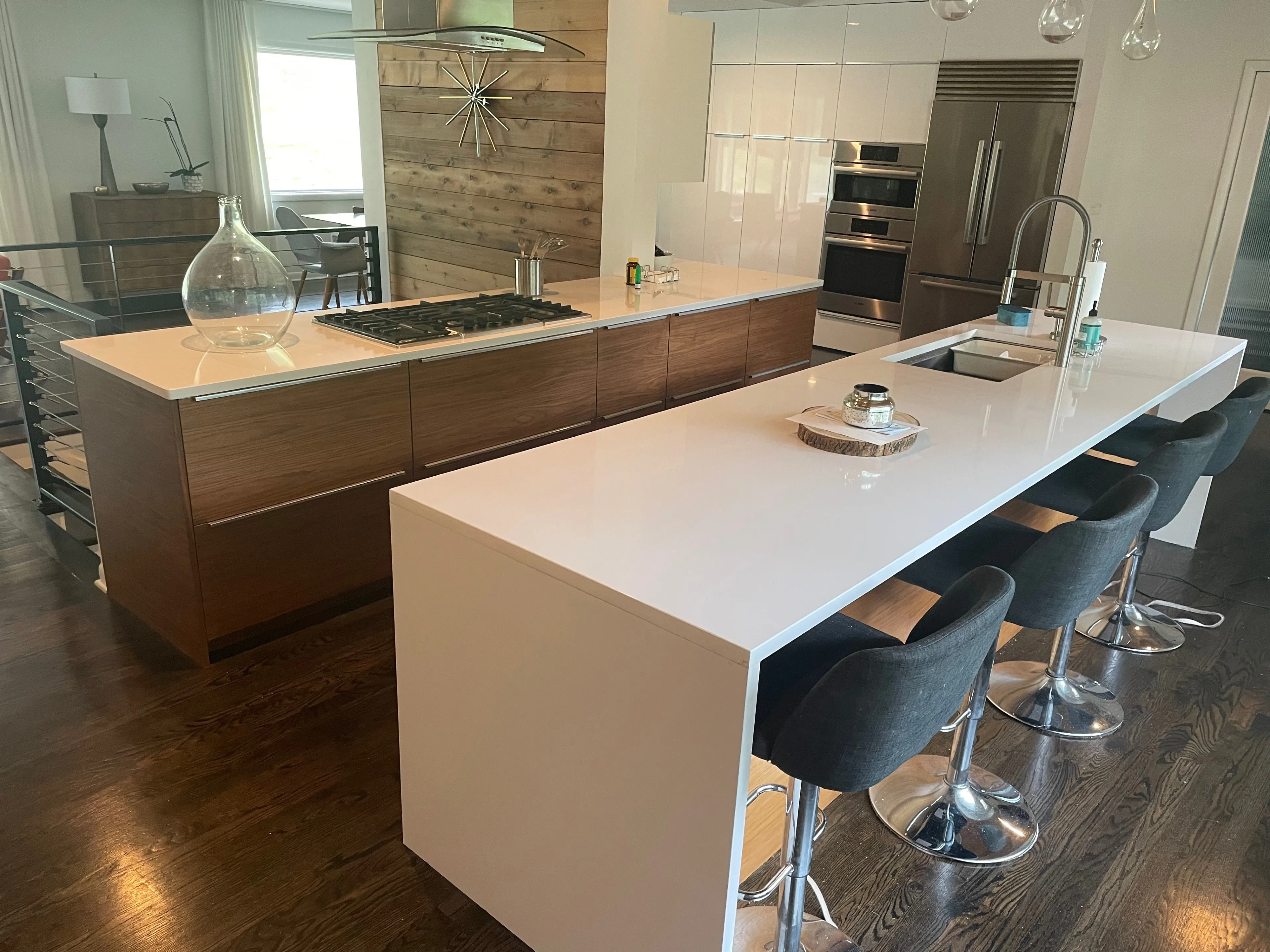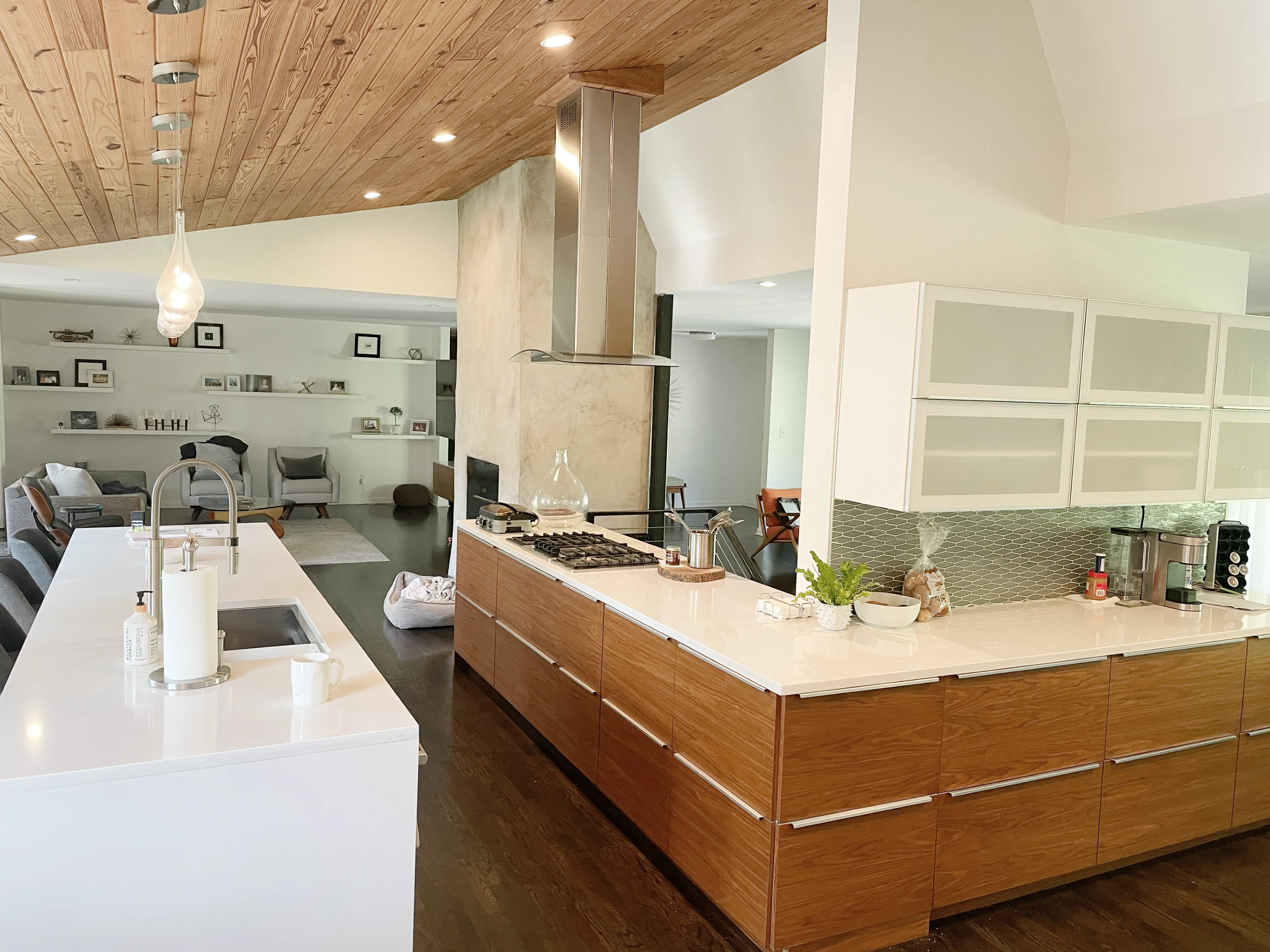 On the inside of the home, the original floor plan on the main level was functional but boxy. The owners and architect undertook an effort to better connect the kitchen and living areas while maintaining functional spaces.The open, connected remodel emphasized open spaces, clean lines and functional living. The ceiling over the kitchen area was vaulted and lined with 1x6 tongue and groove pine to add warmth to the space. Pictured below, The new kitchen design features quartz countertops and lots of cabinets, fronted by walnut faced cabinet doors: